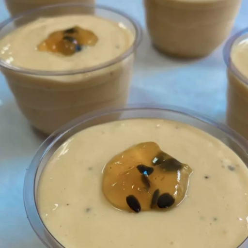 Copo composto por mousse de maracujá feito com a própria fruta e finalizado com geléia de maracujá.