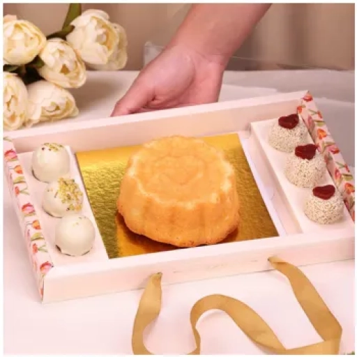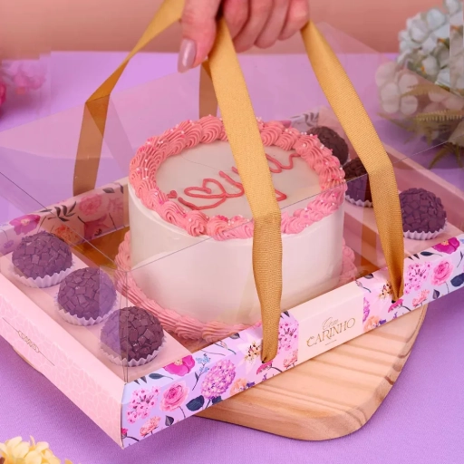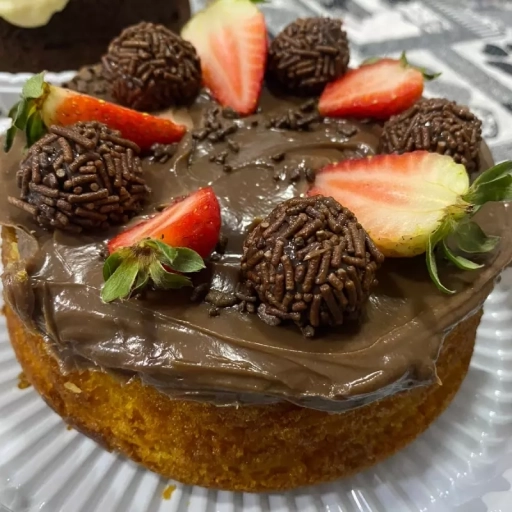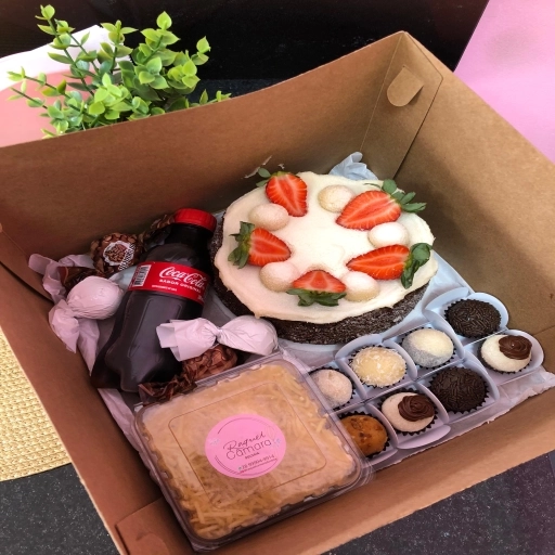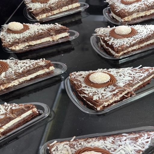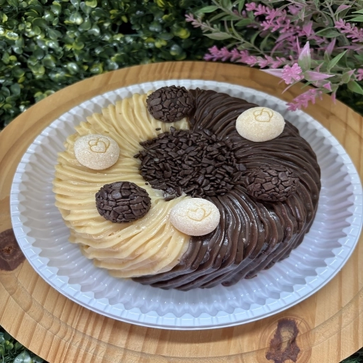 Massa de chocolate, mousse de prestígio, creme de chocolate finalizada com coco flores e docinho.