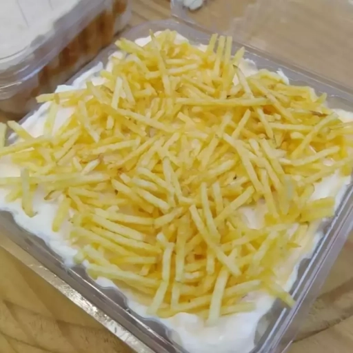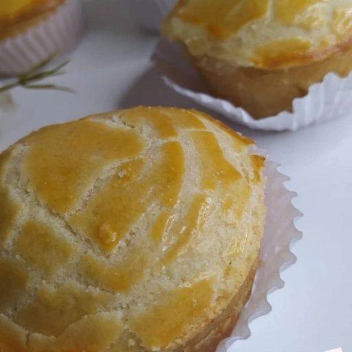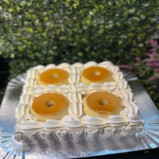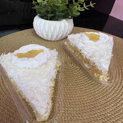 Massa de pão de ló, recheada com abacaxi com coco e finalizada com chantilly e coco flocos.
