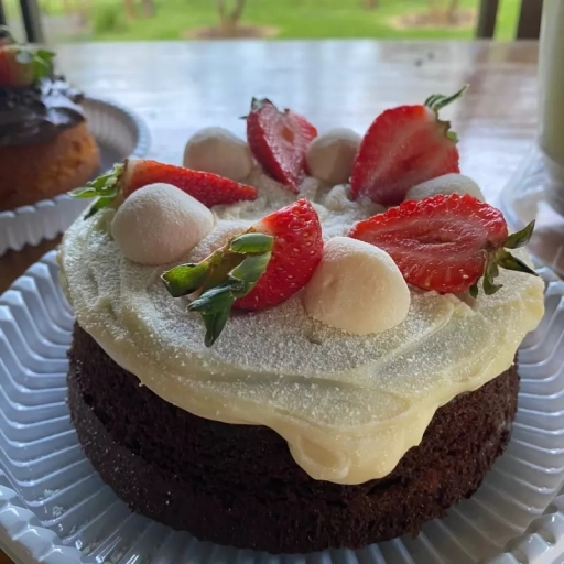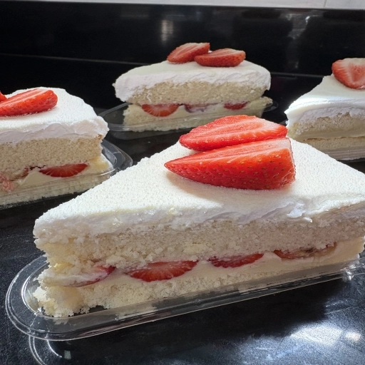 Massa de pão de ló recheada com quatro leites com morangos e finalizado com chantilly, leite em pó e morango.