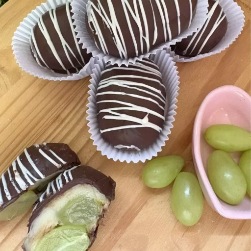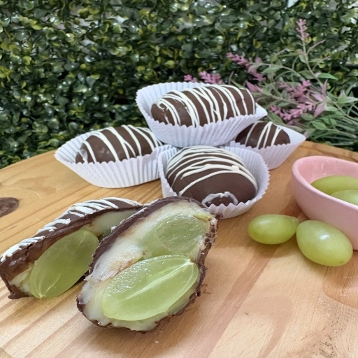 Brigadeiro de ninho, uva verde sem caroço e cobertura de chocolate meio amargo.