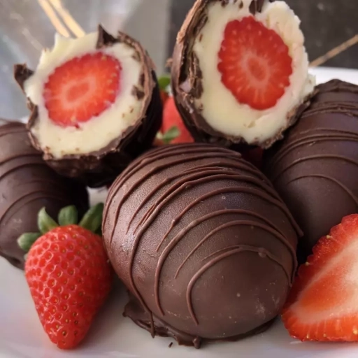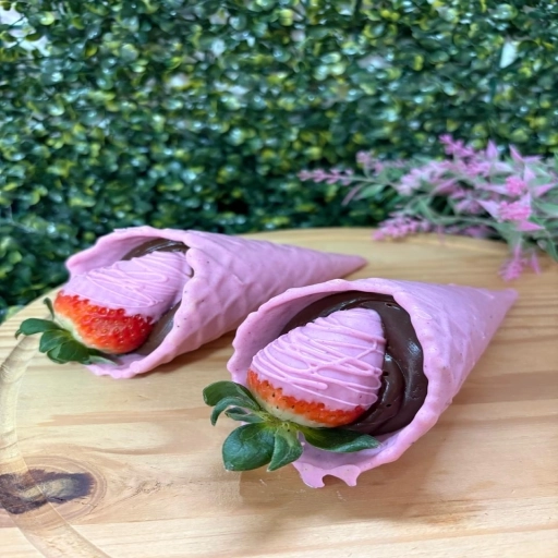 casquinha de sorvete, banhada no chocolate branco recheada com creme de chocolate e morangos.