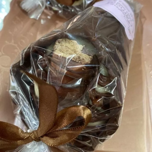 Casca de chocolate meio amargo, com recheio de brigadeiro e granulados.