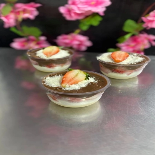 Pote feito com creme de brigadeiro branco, leite em pó, morangos e finalizado com brigadeiro cremoso, leite em pó e mo... Ver completo
