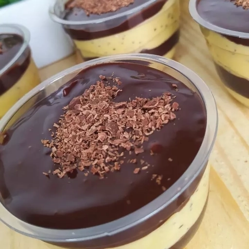 Copo composto por mousse de maracujá feito com a própria fruta e com ganache de chocolate meio amargo.