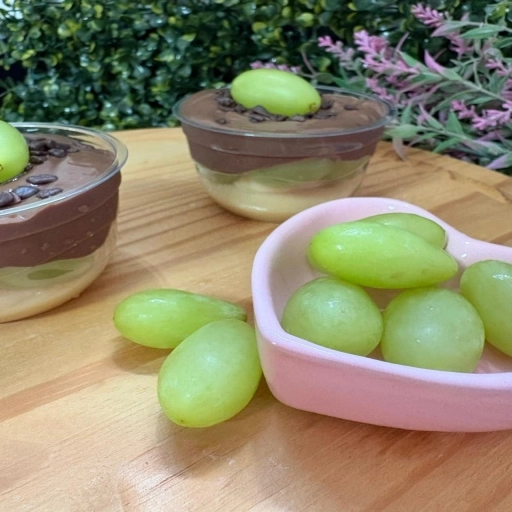 Pote montado com delicioso creme de brigadeiro branco, uvas verde sem caroço e finalizado com granulados e uva.